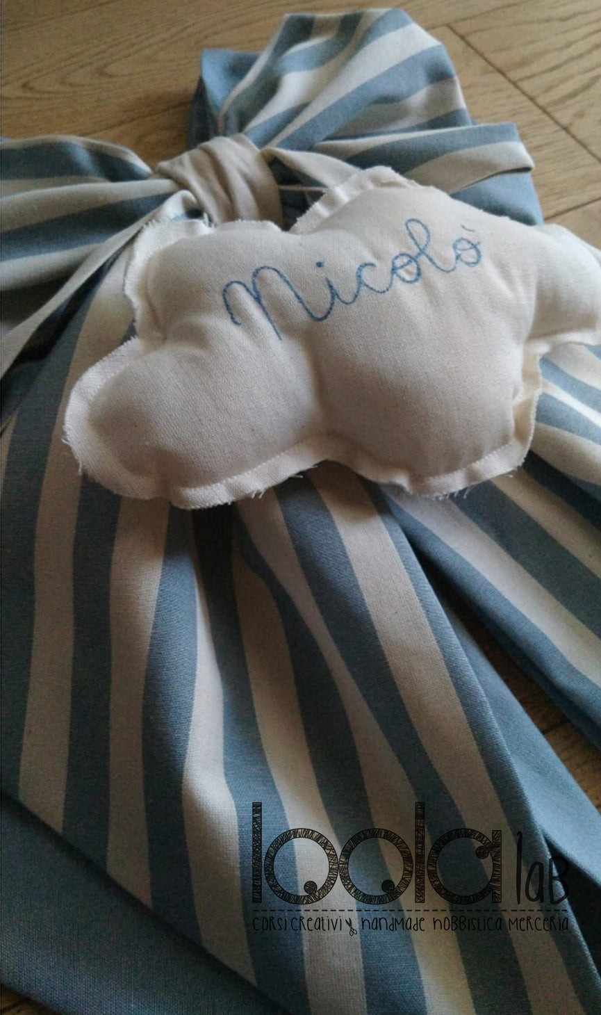 Sul pendente centrale (forma a scelta tra cuore o nuvola) ci sarà il nome ricamato con la macchina a mano libera (tecnica del free motion). La forma che preferisci potrai comunicarla a seguito dell'ordine.