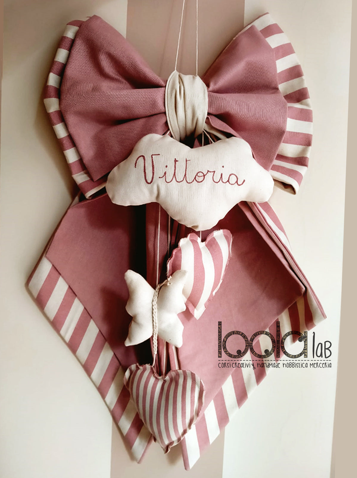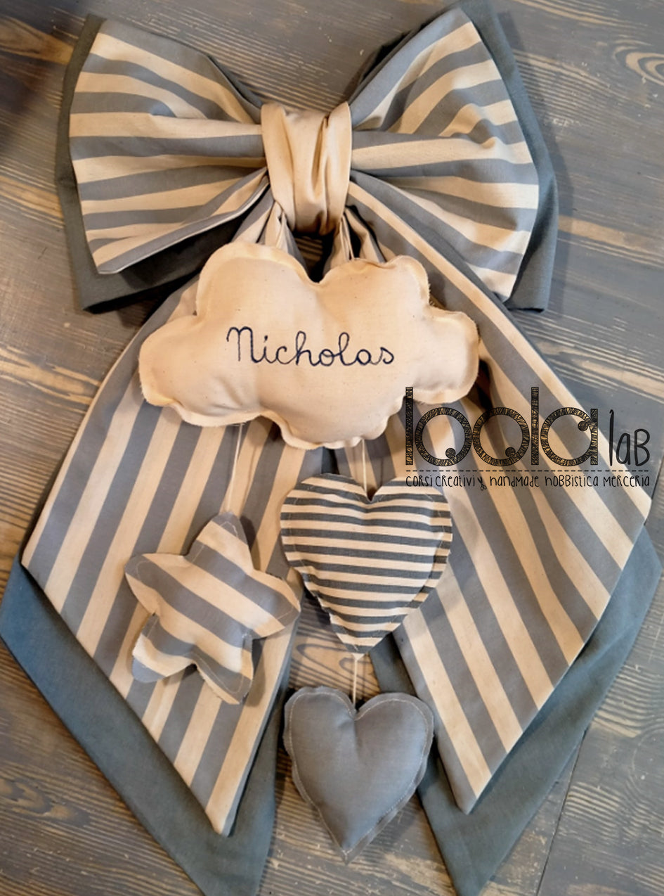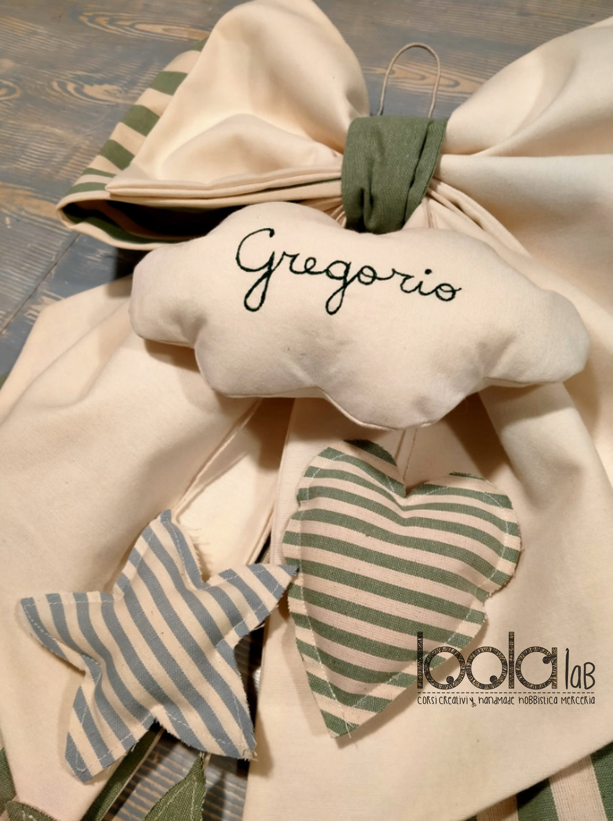 Sul pendente centrale (forma a scelta tra cuore o nuvola) ci sarà il nome ricamato con la macchina a mano libera (tecnica del free motion). La forma che preferisci potrai comunicarla a seguito dell'ordine.