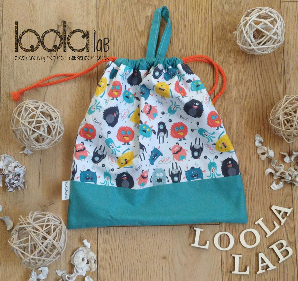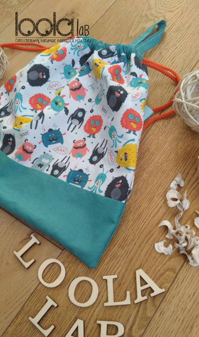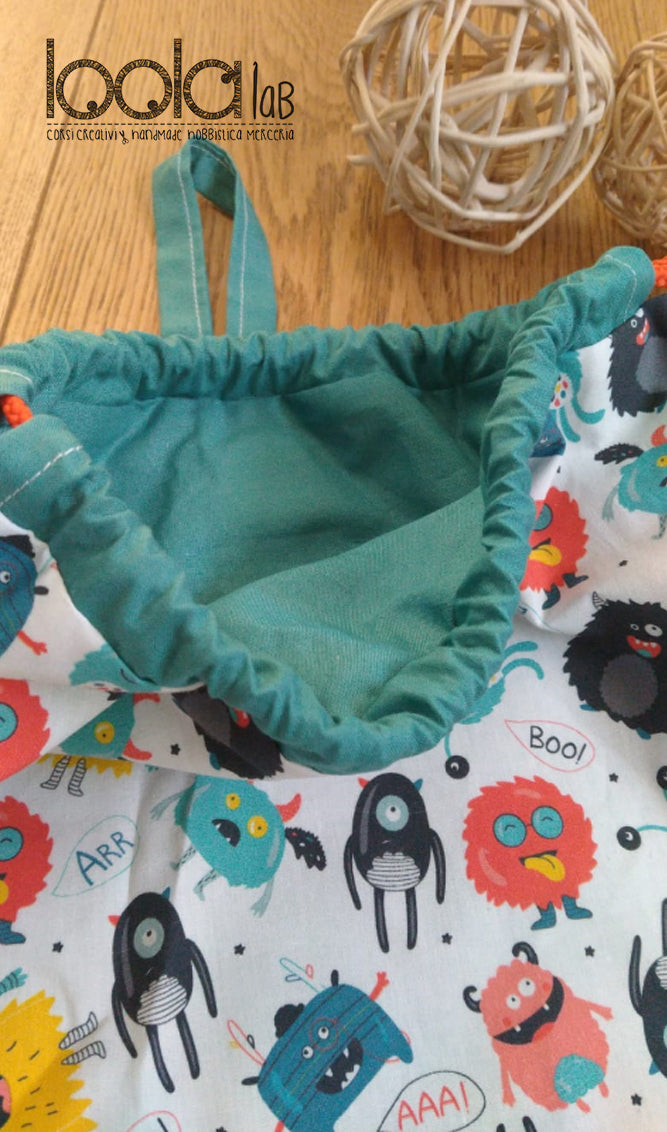 il tessuto ha una stampa che rappresenta dei simpatici mostriciattoli, la base in tinta unita è in color ottanio, i lacci di chiusura sono in arancio.