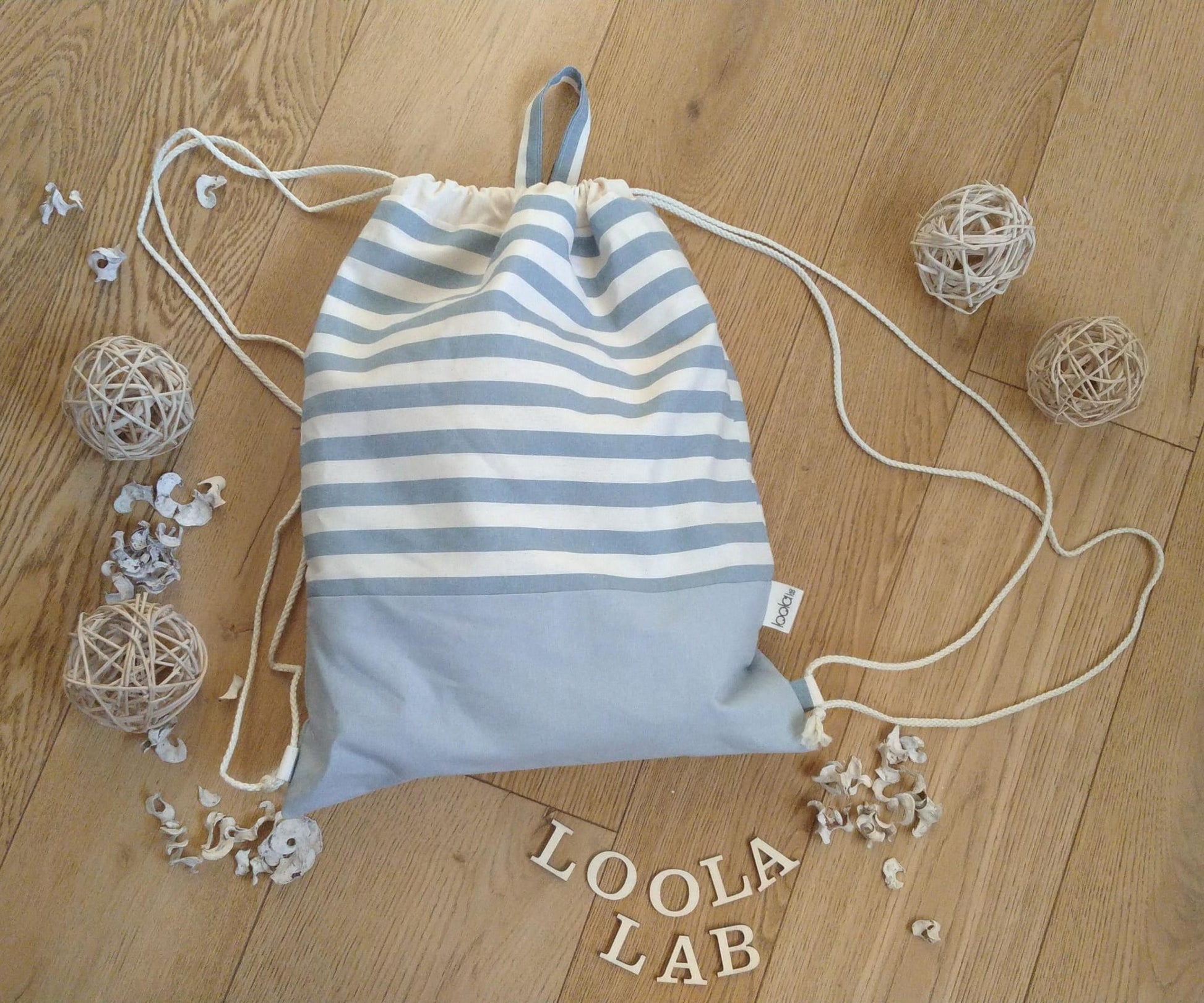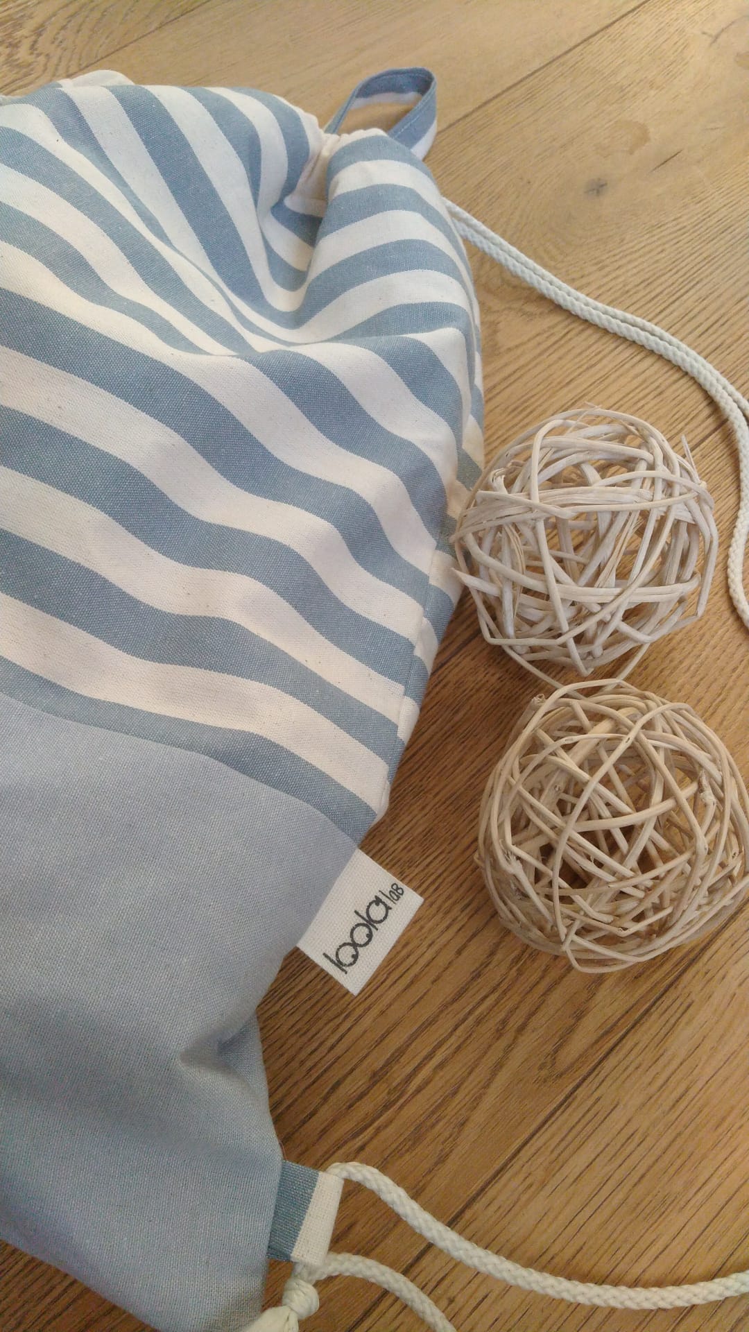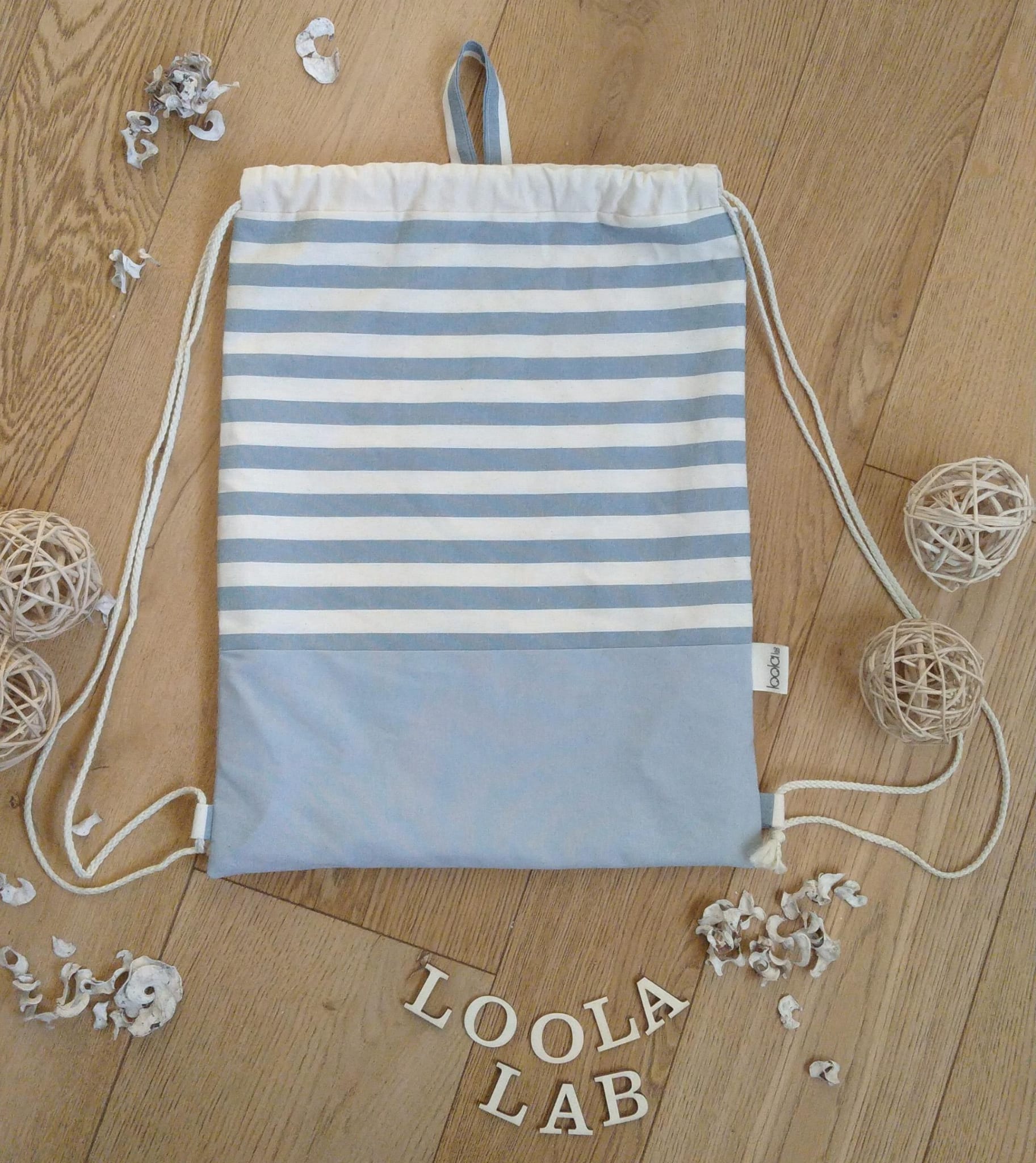 Sacca zaino in tessuto di cotone ideale per contenere il necessario per la scuola o per gli altri spostamenti giornalieri.