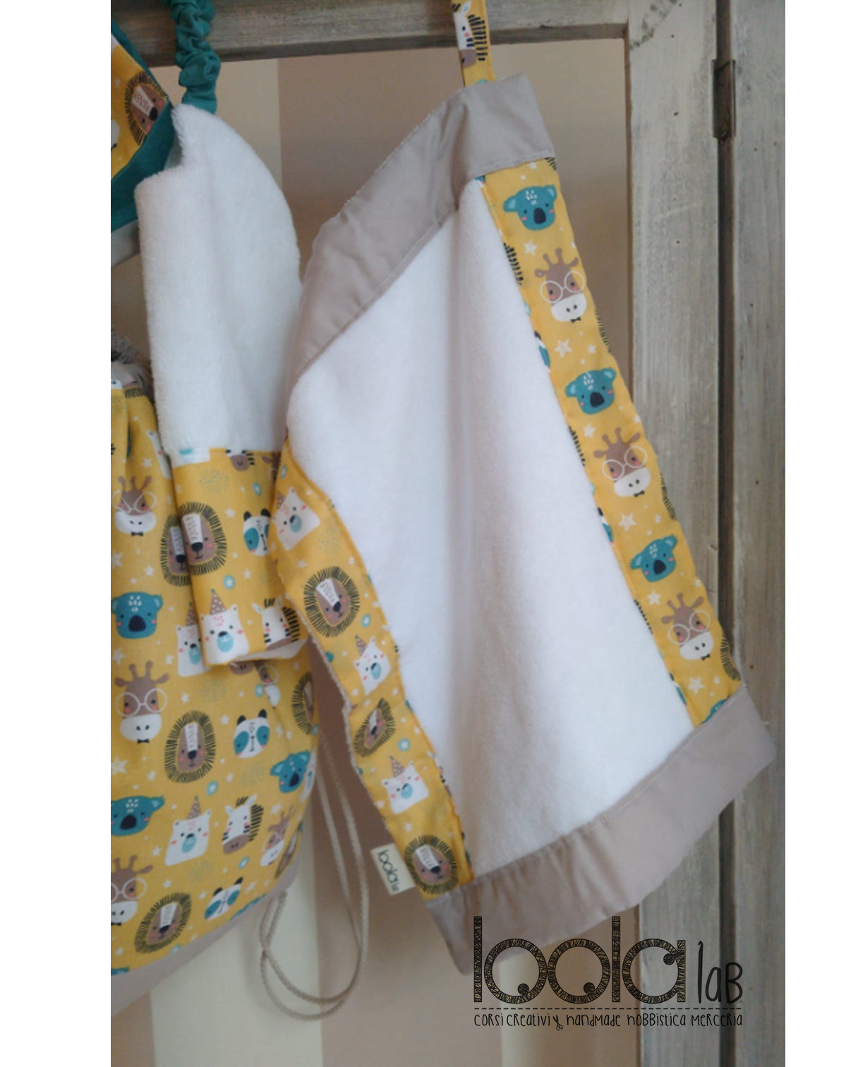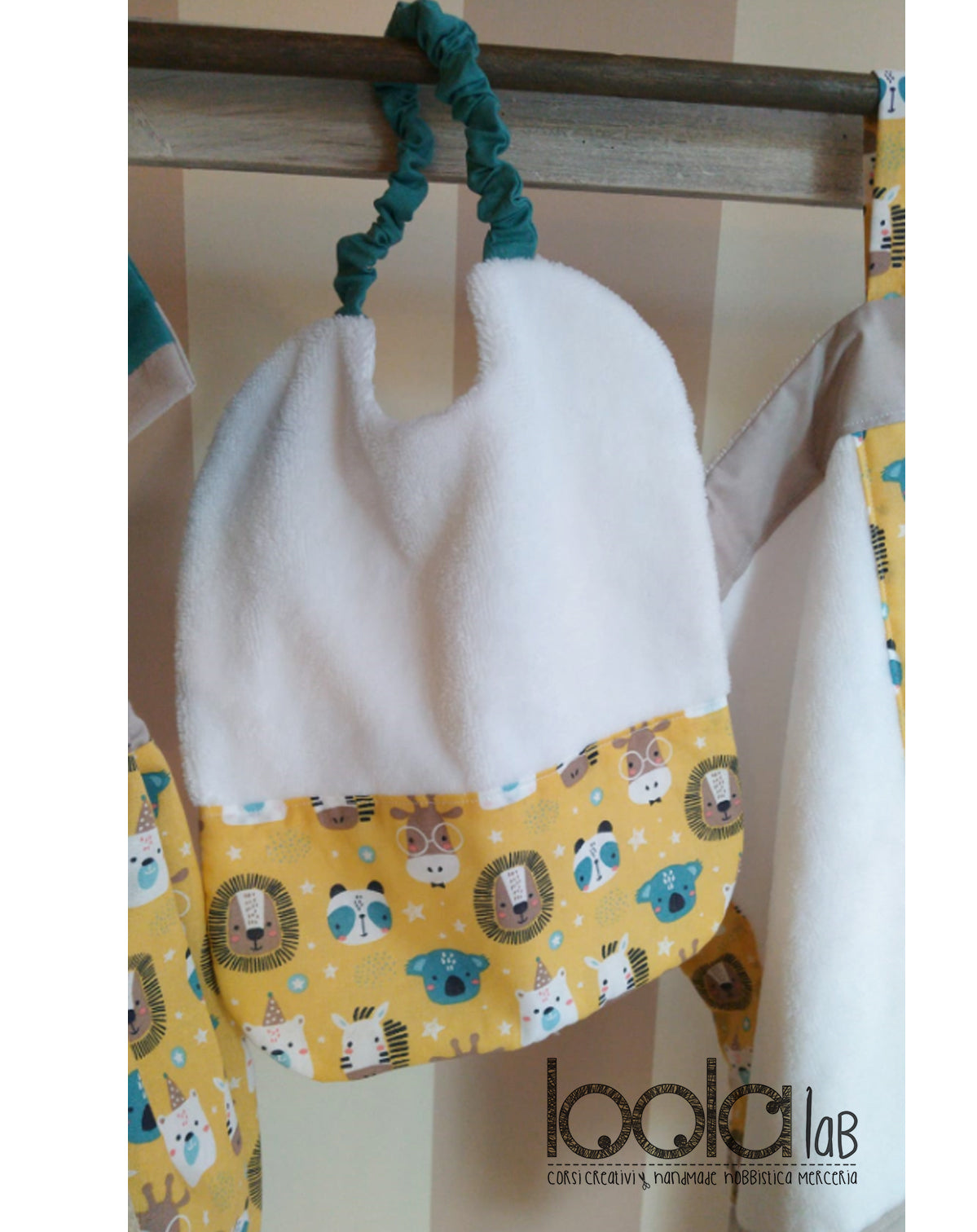 -bavaglino in spugna di bamboo e tessuto in cotone a fantasia, laccio elastico